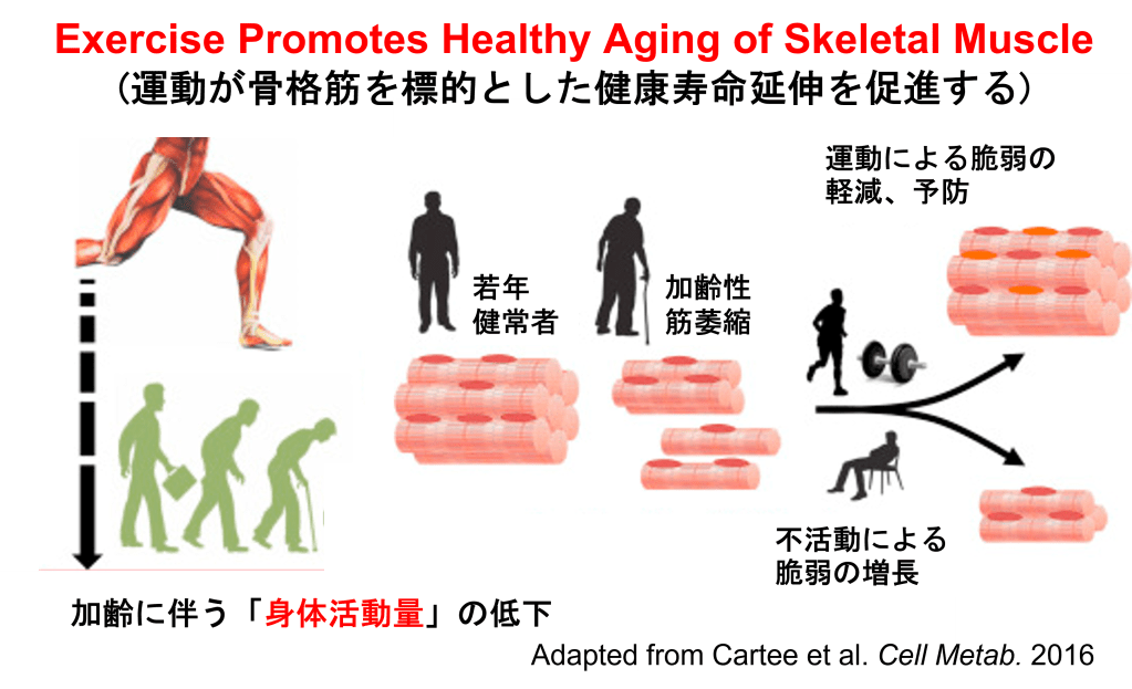 健康で若々しく生活する健康寿命の延伸を目指す上で、運動を行い身体不活動を減らすことが推奨されています。運動実施を普及するためにも運動が健康を促進するエビデンスをより理解してもらえるよう基礎的知見を提供することが今後より必要となります。そのために私たちは動物実験などを対象として何故運動が健康を獲得するのか?という疑問を明らかにすることを課題にしています。