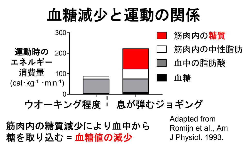 例えば、ウォ-キングなどは血中の脂肪酸のみを優先的に消費しますが、ジョギングなどの運動は筋肉の糖質も優先的に消費します。つまり、運動が筋肉の中の糖質を減らすように働きかけることが、運動がなぜ糖尿病に有効であるのかという理由です。